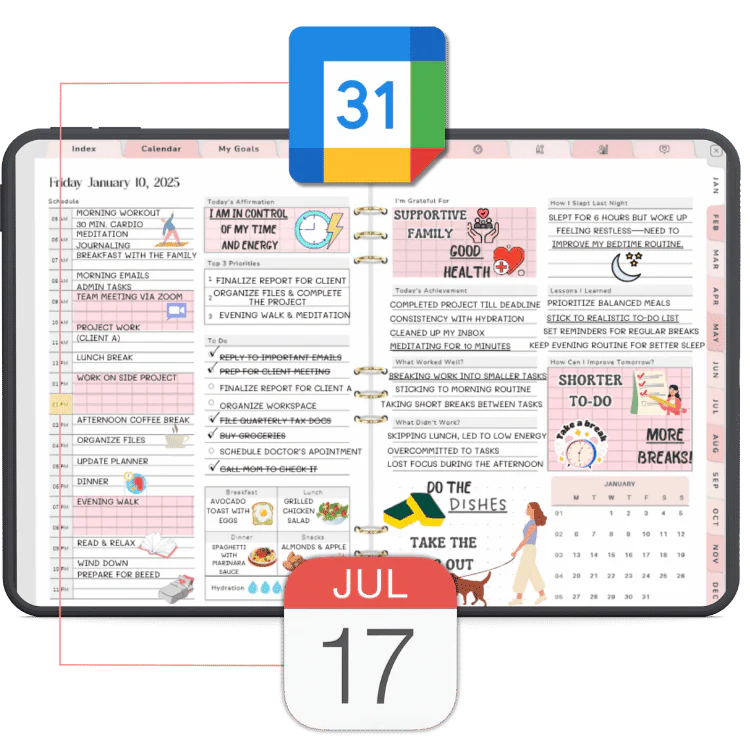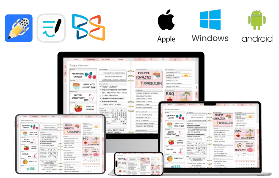 The EaseUp Digital Planner is compatible with Apple, Android, and Windows devices, seamlessly integrating with PDF apps like Goodnotes or Xodo!
